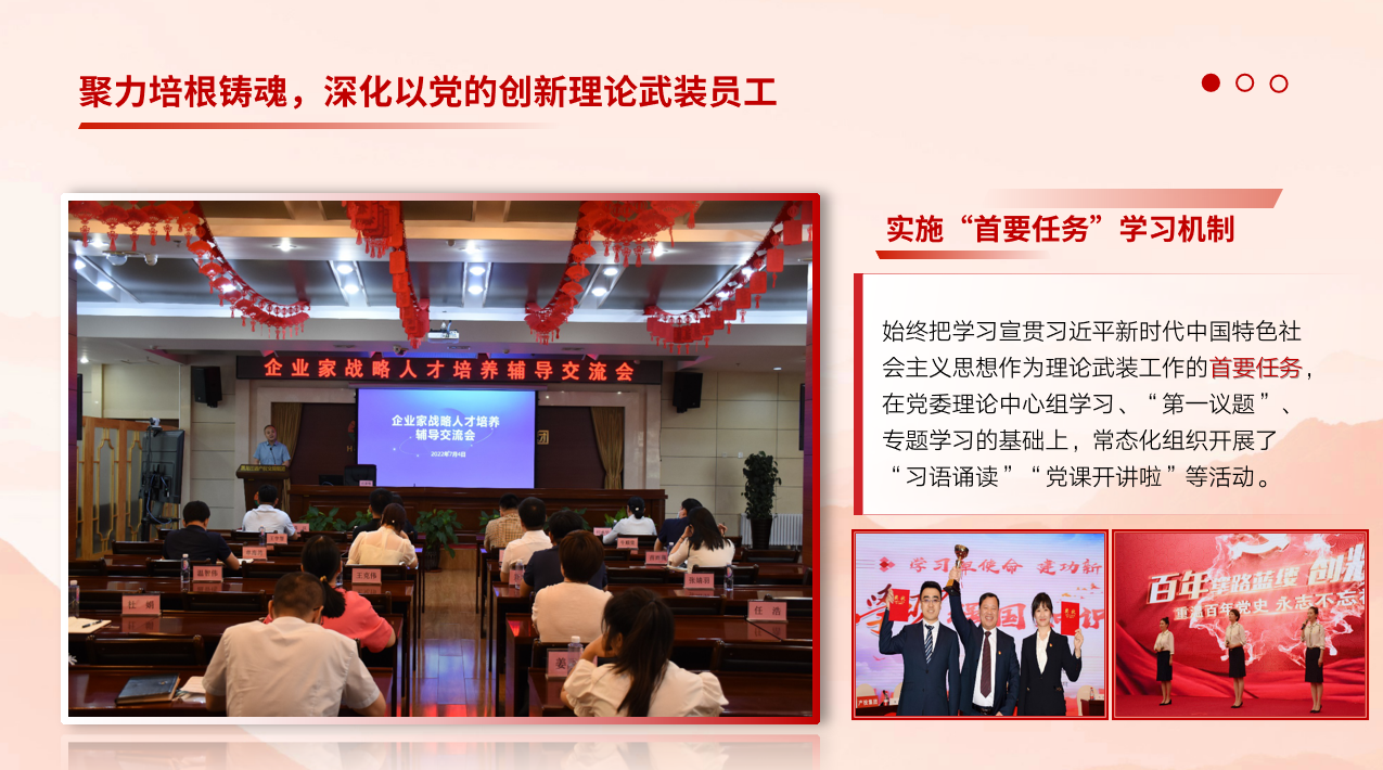 近年來,集團(tuán)黨委堅持把思想政治工作作為一項經(jīng)常性、基礎(chǔ)性工作來抓,融入現(xiàn)代企業(yè)治理、經(jīng)營管理、企業(yè)文化建設(shè)、員工隊伍建設(shè),形成了全員、全程、全覆蓋的國有企業(yè)大思政模式,有效發(fā)揮了“生命線”的獨特作用,推動了企業(yè)高質(zhì)量發(fā)展。實施“首要任務(wù)”學(xué)習(xí)機(jī)制,實施核心價值培育機(jī)制,實施企業(yè)文化熔鑄機(jī)制,推動愛國主義、集體主義、社會主義教育深深融入員工血脈,厚培員工以企為家、愛企如家的歸屬感和凝聚力。