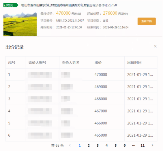 其中一宗517畝耕地,掛牌底價(jià)為27.6萬(wàn)元,經(jīng)過(guò)65輪次競(jìng)價(jià),最終以47萬(wàn)元成交,成交溢價(jià)19.4萬(wàn)元,平均每畝地給村集體帶來(lái)375元增值收益。