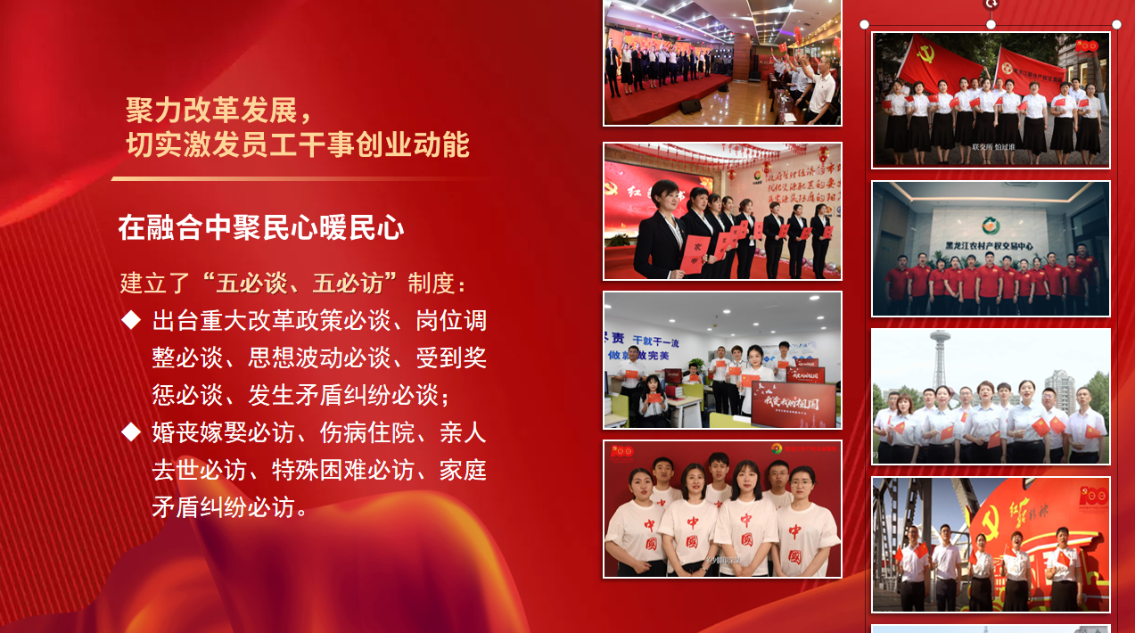 集團(tuán)黨委還引導(dǎo)黨員員工開展自主教育,組織開展“四愛四創(chuàng)”主題思想教育、“提質(zhì)增效、黨員先行”主題實踐活動和“我為集團(tuán)發(fā)展獻(xiàn)一策”建議征集活動,充分激發(fā)員工“主人翁”意識,通過發(fā)揮思想政治工作統(tǒng)一思想、凝聚共識的重要作用,推動集團(tuán)不斷實現(xiàn)高質(zhì)量發(fā)展,為龍江全面振興全方位振興貢獻(xiàn)了平臺力量。