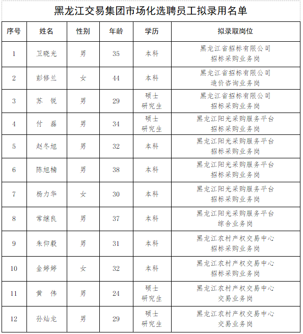 按照黑龍江交易集團(tuán)有限公司2023年度員工招聘計(jì)劃,結(jié)合黑龍江省省市縣三級聯(lián)動大型招聘會暨第四屆春風(fēng)云聘會活動,經(jīng)報(bào)名、資格審查、筆試、面試等環(huán)節(jié),確定了擬錄用人員。現(xiàn)對擬錄用人員信息進(jìn)行公示,名單如下。
